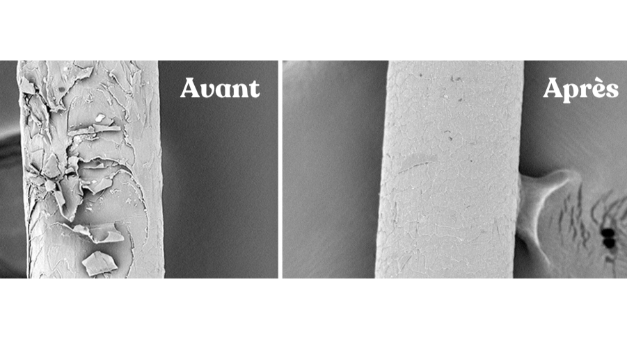 - Réparation des liaisons capillaires (pénètre en profondeur pour atteindre les chaînes de polypeptides et reconnecter les chaînes de kératine brisées).
